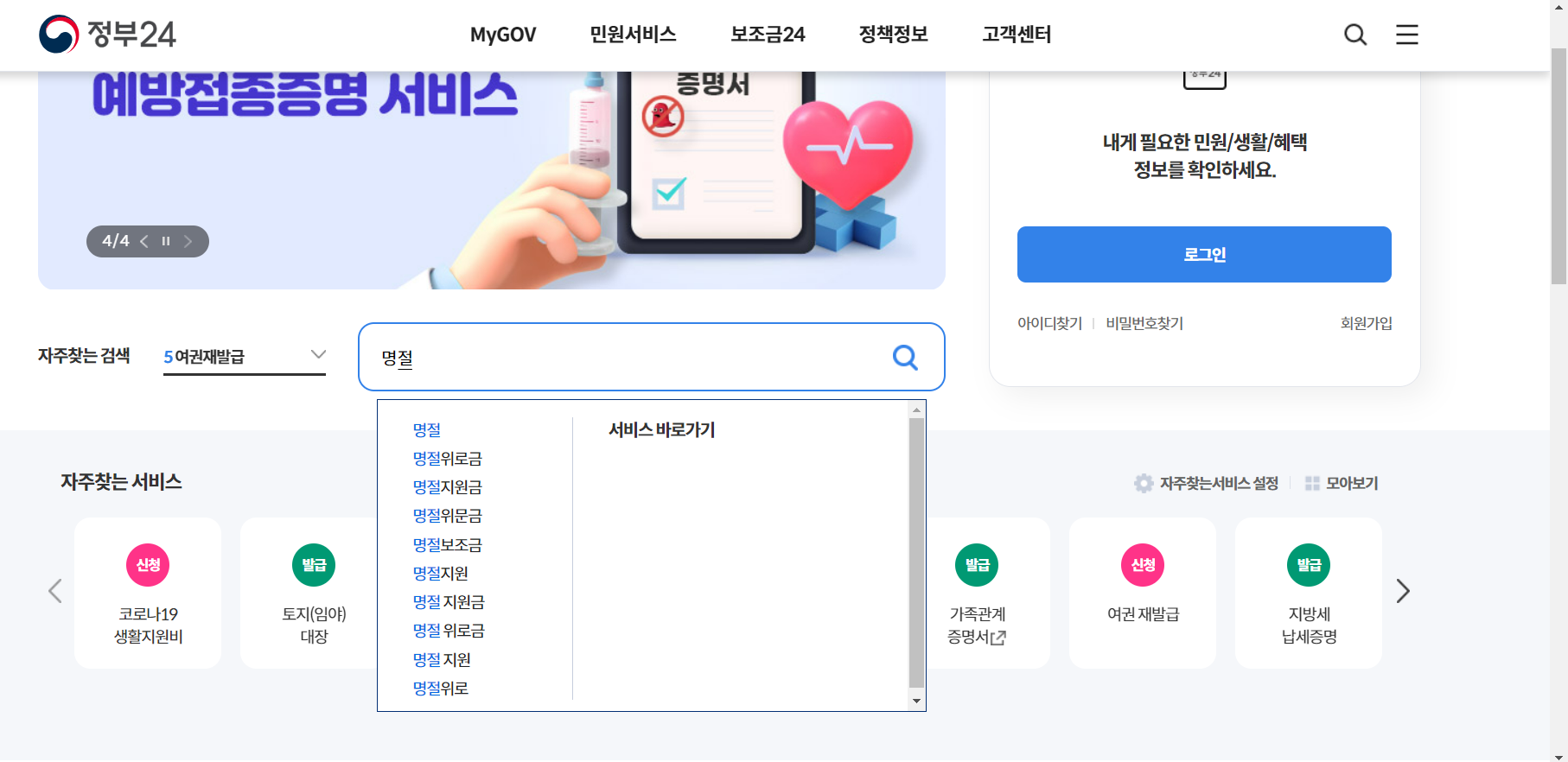 먼저, 아래에 나와있는 링크를 통해 정부 24 메인 화면에서 검색창에 '명절' 검색합니다. 참고로 정부24에서는 공문발급, 민원서비스, 정책정보 등등 여러 서비스도 이용하실 수 있습니다.