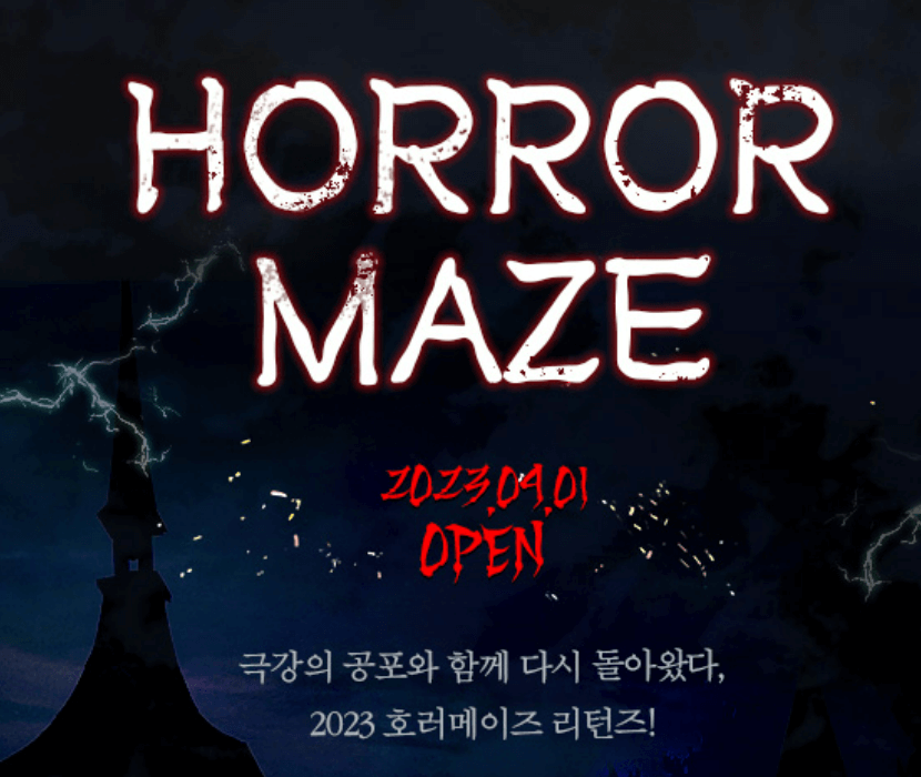 호러메이즈는 2023년 9월 1일 금요일부터 11월 19일 일요일까지 진행됩니다. 장소는 에버랜드 블러드시티 호러메이즈(T 익스프레스 맞은 편)입니다. 입장 요금은 1인 기준 1만 원입니다.