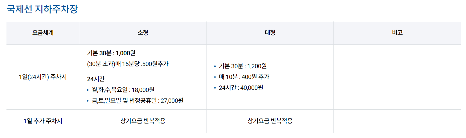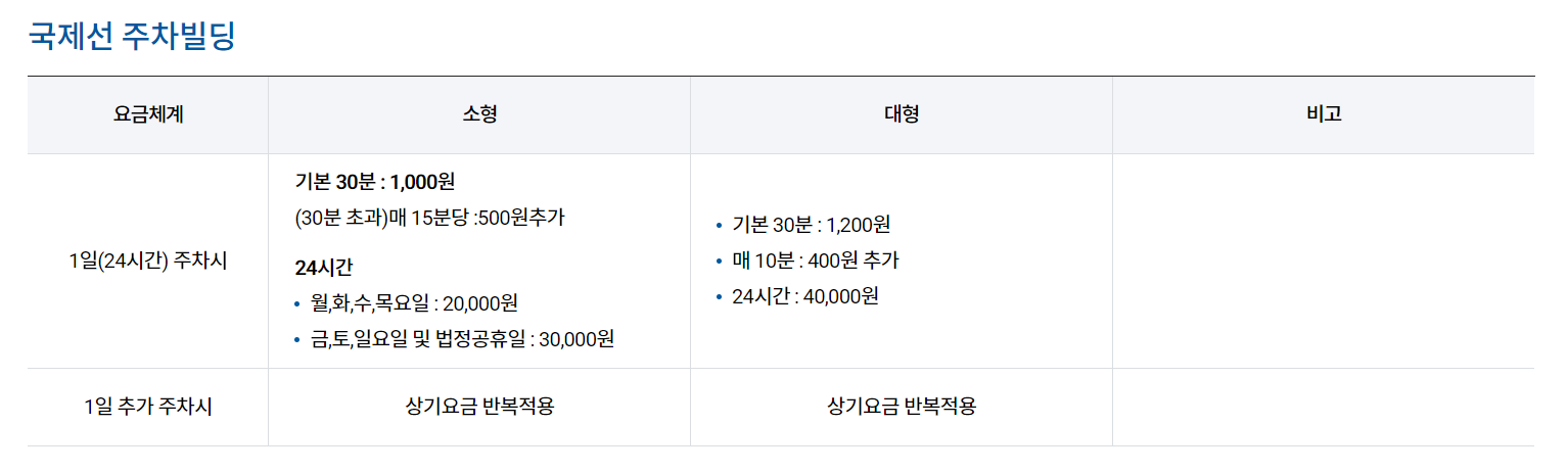 한편, 대형차의 경우 기본 30분당 1,200원 소요되며, 이후 매 10분마다 400원이 추가됩니다. 하루 24시간 동안 주차할 경우 40,000원이 부과되는데 지금 알려드린 국제선 주차요금은 5개 주차장 모두 공통적으로 적용됩니다. 또, 1일 추가 주차 시 위의 요금이 반복 적용되는 점도 참고바랍니다.