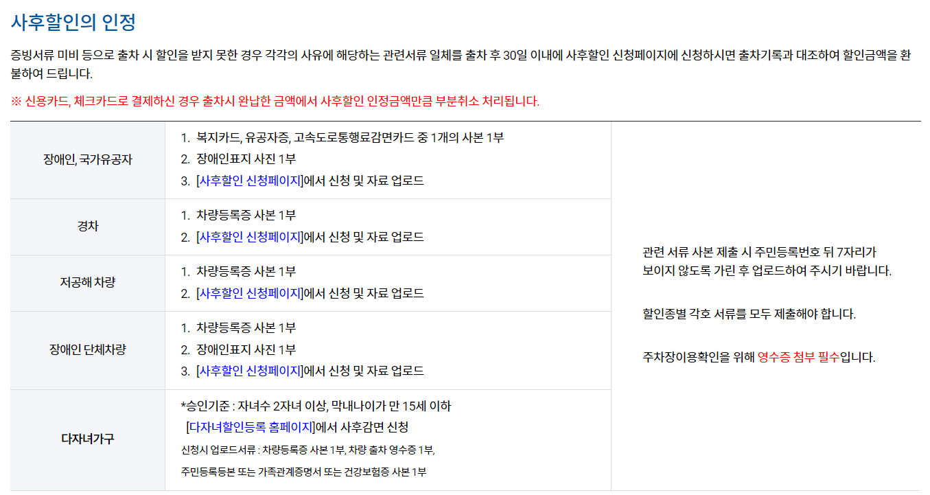 할인 꿀팁(?)을 한 가지 알려드리자면 과거와 비교해볼 때 현재는 주차요금이 사후할인이 가능하다는 점입니다. 증빙서류 부족으로 할인 적용을 못 받아도 출차 후 30일 이내에 할인신청서를 제출하면 할인금액을 사후에 돌려받으실 수 있습니다.