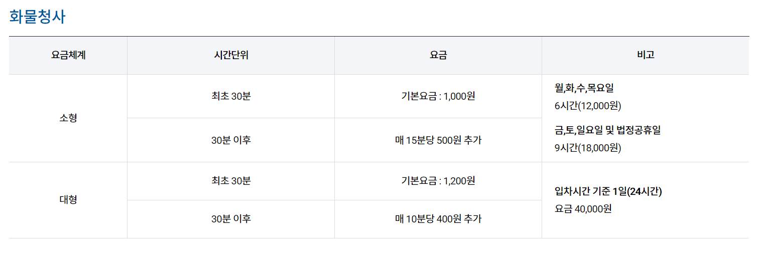 마지막으로 화물청사 주차요금입니다. 화물청사 주차요금은 기본요금이 최초 30분 1,000원으로 월/화/수/목요일은 6시간에 12,000원입니다. 참고로, 화물청사 주차장은 국내선·국제선 청사와 어느 정도 거리가 있습니다. 셔틀버스가 운영되는데 셔틀 이용 시간을 고려해 이용하셔야 하는 점 참고하시기 바랍니다.
