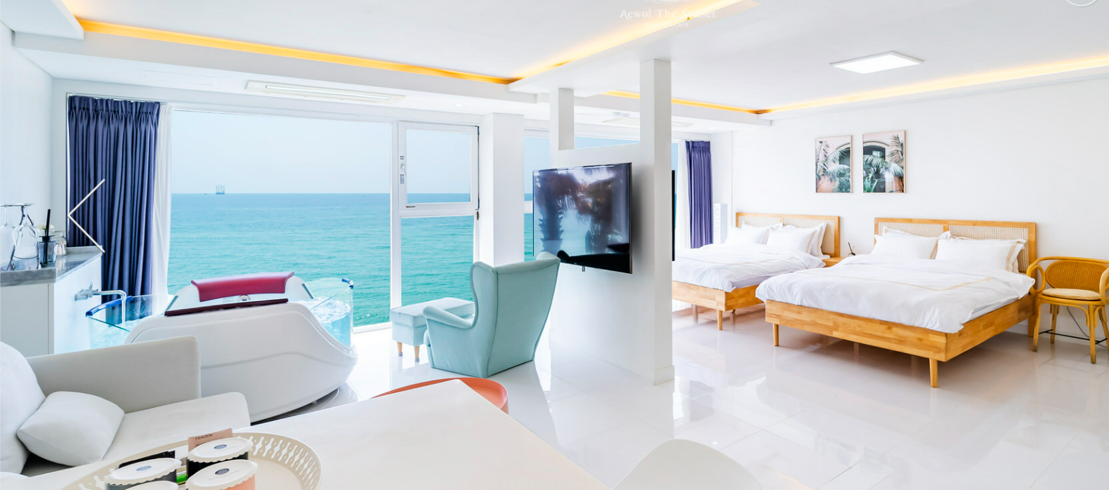 제주시 애월읍에 위치한 애월더선셋 리조트는 에메랄드빛 바다 풍경으로 제주도의 매력적인 오션뷰를 자랑하는 제주도 오션뷰 숙소 중 한 곳입니다. 외부의 멋진 오션뷰와 함께 리조트 객실 내부 역시 세련되고 깔끔한 인테리어가 조화를 이루는 곳인데요. 애월의 일몰이라는 상징을 가진 애월더선셋 리조트는 이름의 가치에 맞게 제주도 바다의 풍경을 감상하고 힐링하기에 부족함이 없답니다.