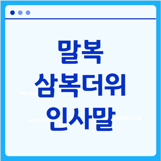 오늘은 말복 인사말에 이어 삼복더위 인사말 모두 소개드립니다. 말 많고 탈 많던 장마철이 지나고 찜통더위가 이어지니 다시 한 번 여러 사건사고 소식이 곳곳에서 들리고 있는데요. 이러한 삼복더위를 조금이라도 더 잘 극복하실 수 있게 말복 인사말과 삼복더위 인사말을 준비해보았습니다. 복날을 맞이하여 주변 지인분들에게 말복 삼복더위 인사말을 안부 삼아 전해보시는 건 어떠세요?