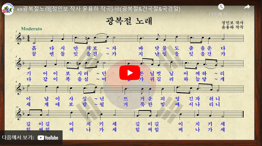 아래는 광복절 노래 악보 동영상을 유튜브에서 만나보실 수 있습니다.